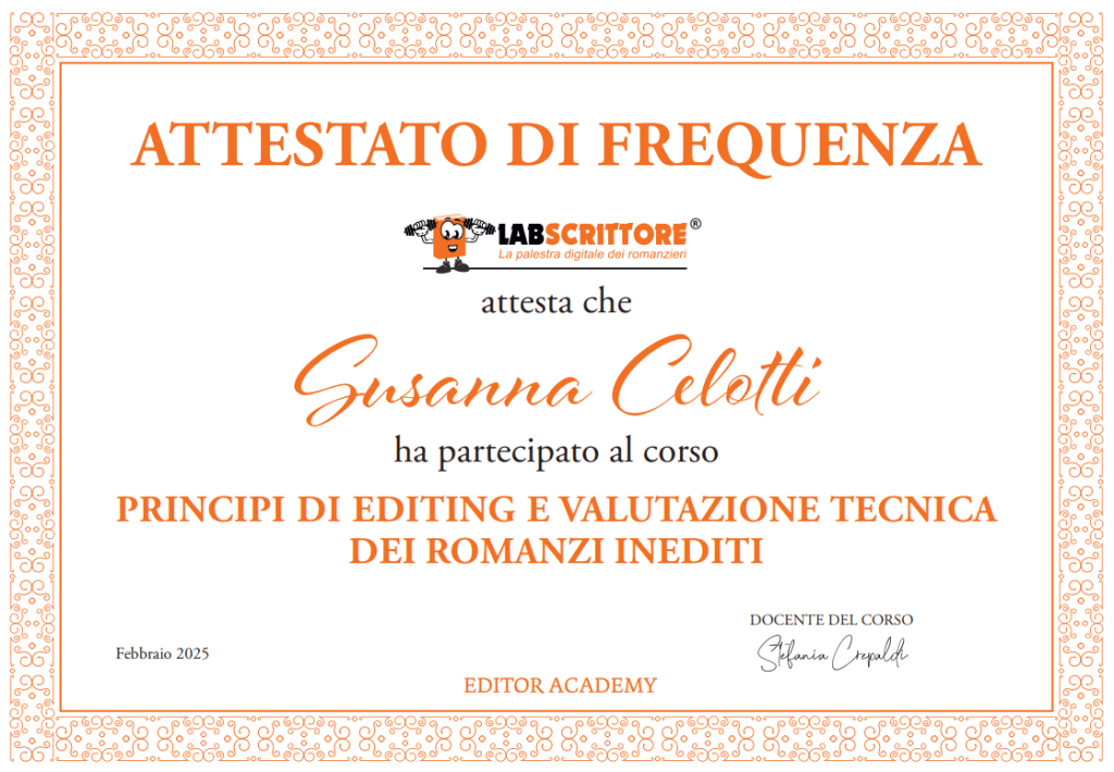 Disclaimer – Il mio obiettivo è leggere con occhi diversi la tua storia e fornirti un feedback per aiutarti a renderla la migliore versione di se stessa, rispettando sempre la tua voce e la tua visione. Il servizio che offro non è una semplice correzione di bozze, non è un editing interlinea e non garantisce la pubblicazione presso case editrici o l’accettazione da parte di agenzie letterarie.